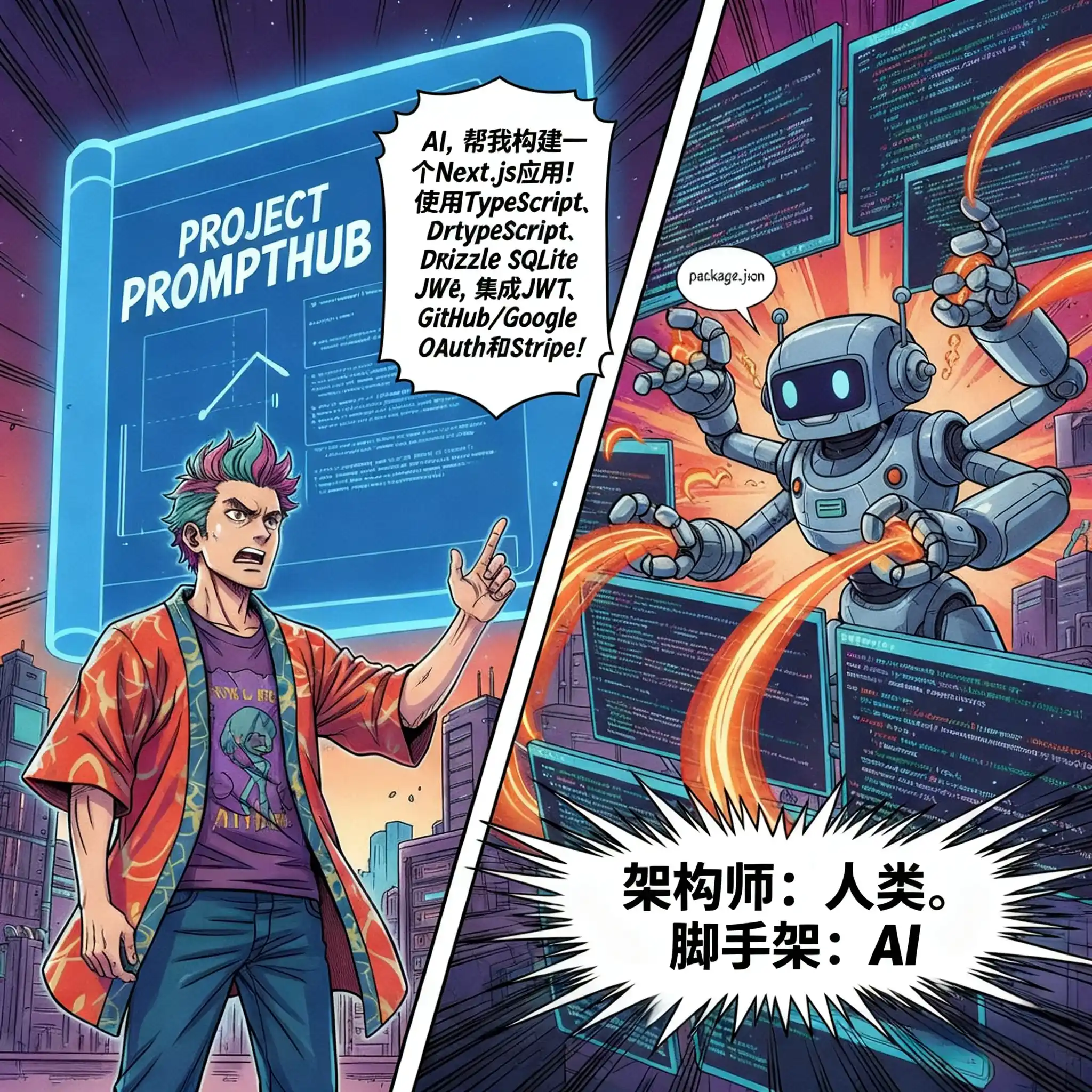 “我要一个Next.js项目,用TypeScript。集成Drizzle ORM,数据库用SQLite。给我加上JWT认证,实现Google和GitHub的OAuth登录。再把Stripe的计费框架搭起来,给我留好接口。”
